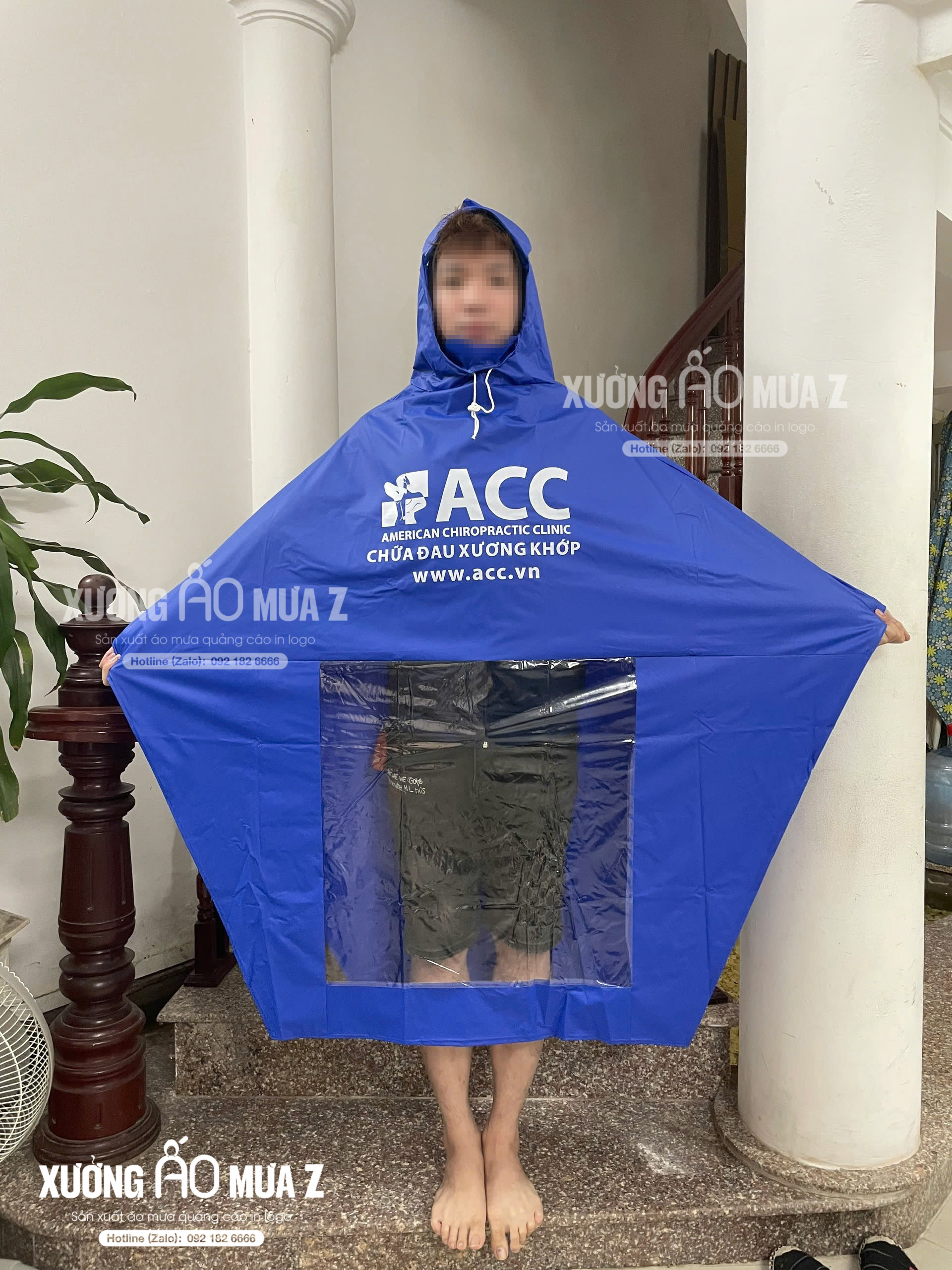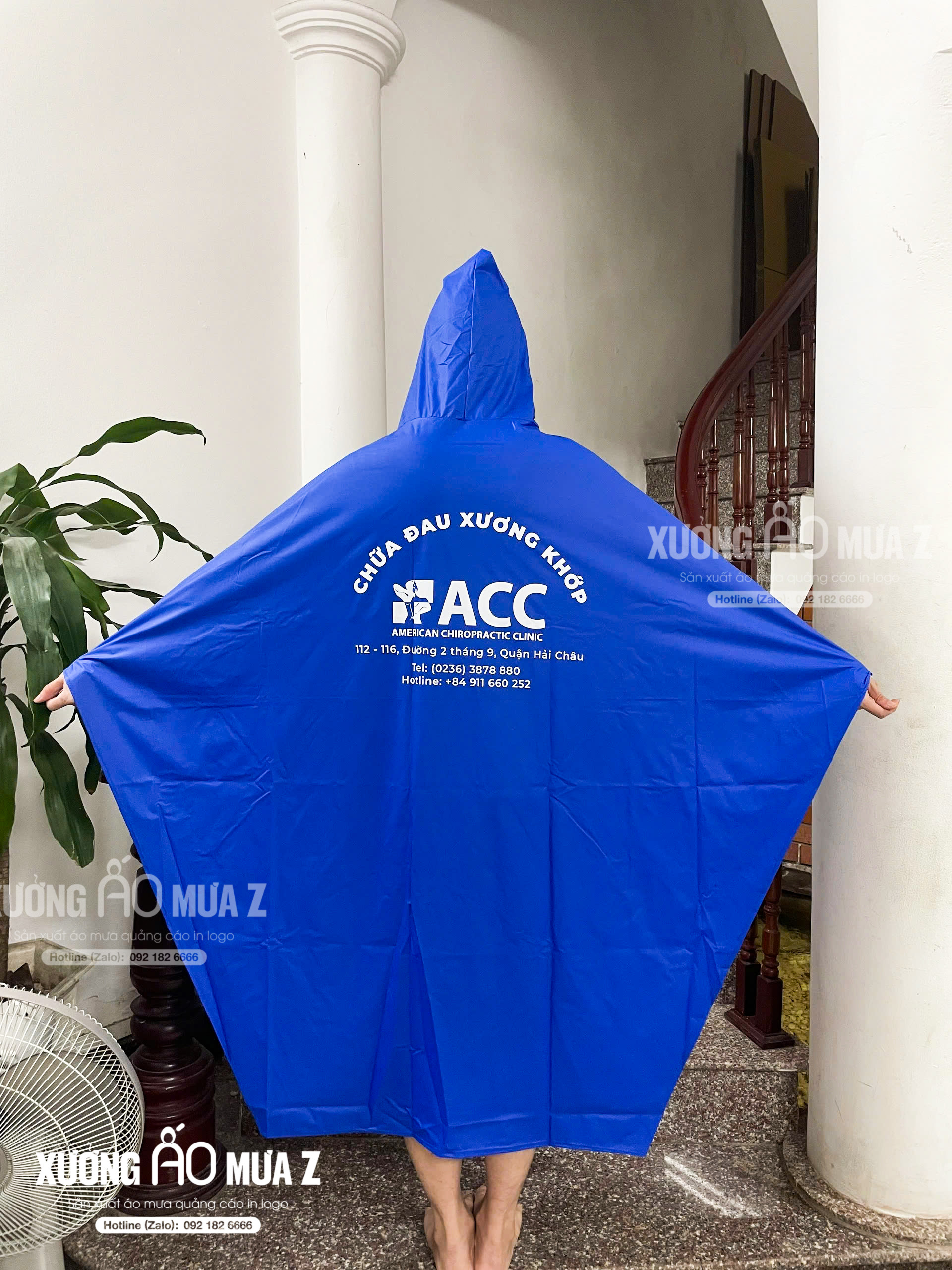 Mẫu áo mưa cánh dơi cao cấp chất liệu nhựa PVC in logo thương hiệu Phòng khám chuyên khoa trị liệu thần kinh cột sống Hoa Kỳ – ACC, là sản phẩm được Xưởng Áo Mưa Z trực tiếp thiết kế & sản xuất theo yêu cầu. Đây không chỉ là chiếc áo mưa tiện dụng trong mùa mưa mà còn là công cụ quảng bá thương hiệu hiệu quả, mang lại hình ảnh chuyên nghiệp và gần gũi cho phòng khám.